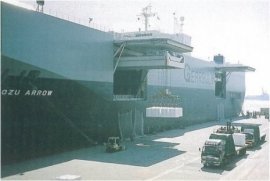 以前はこの大きさの船は清水港に入れませんでしたが、新興津[しんおきつ]コンテナターミナルができ、大きなコンテナ船が入れるようになりました。